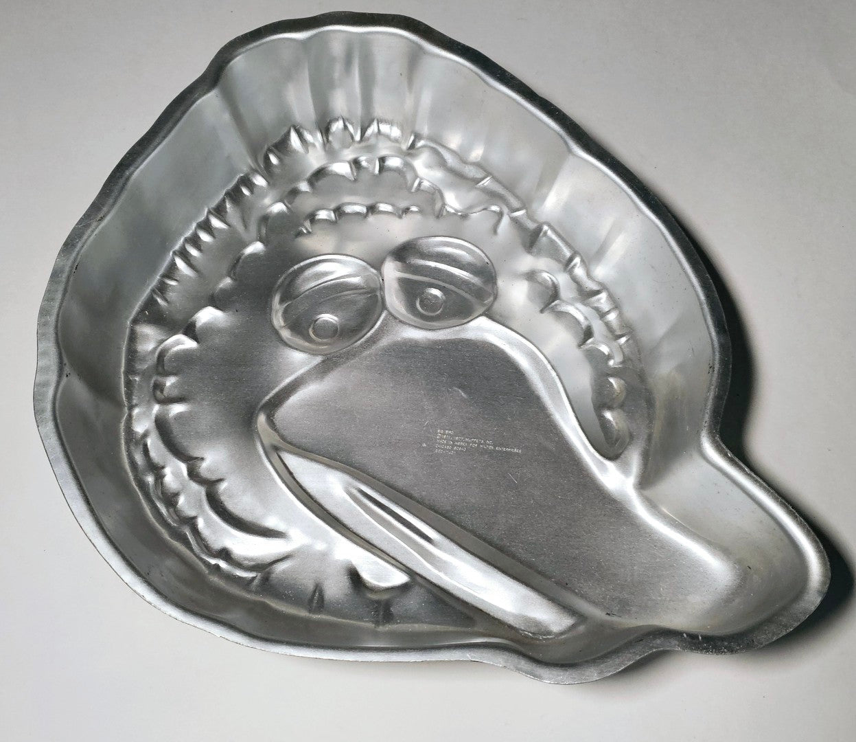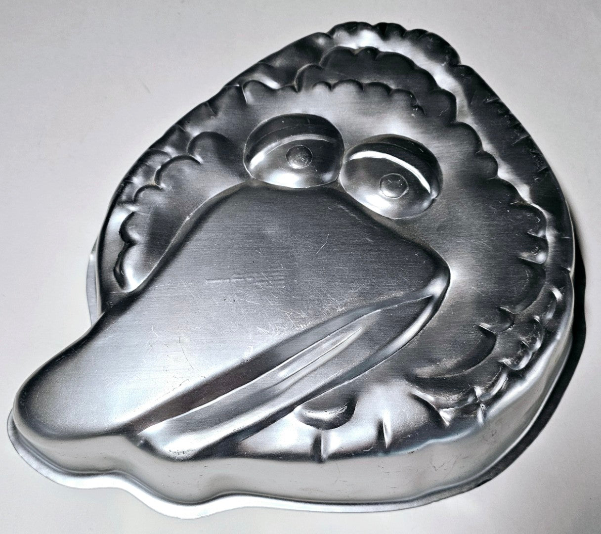 This aluminum cake pan is in good condition, showcases the loveable Big Bird from Sesame St with his ever so long beak.