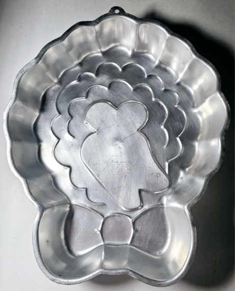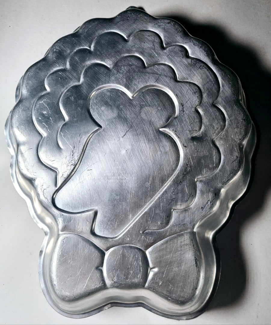 This aluminum cake pan is in good condition, showcases the loveable Big Bird from Sesame St with a big smile and bow tie.