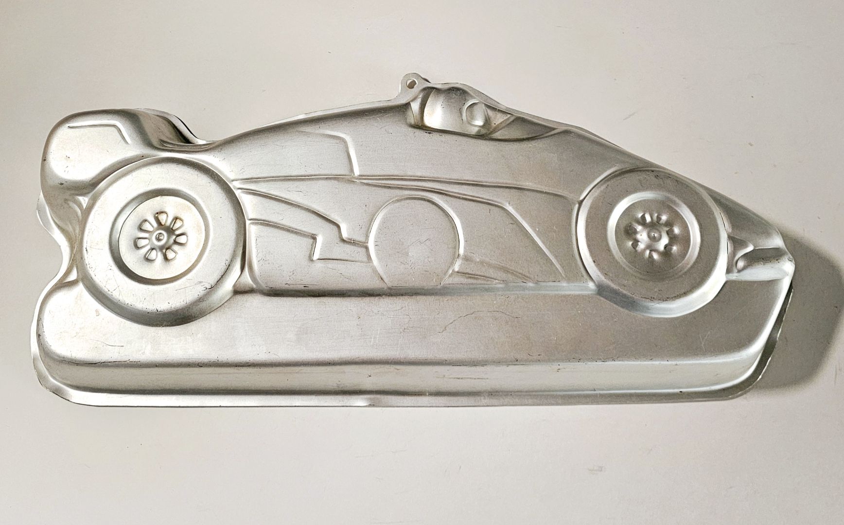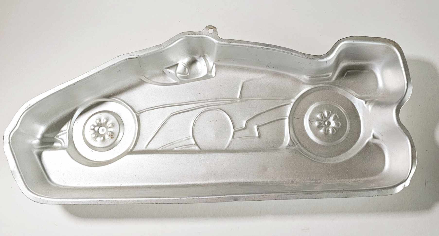 This aluminum cake pan, is in good condition, showcases a Race Car.